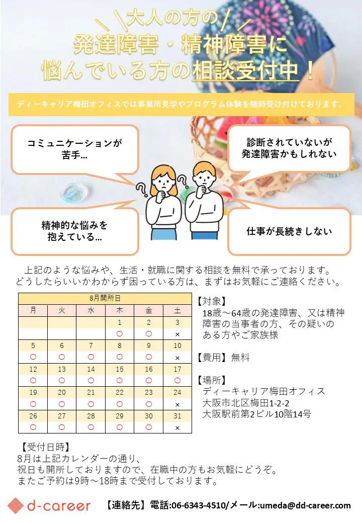 【ディーキャリア梅田オフィス】8月平日開催「8月の事業所見学・体験日のお知らせ」