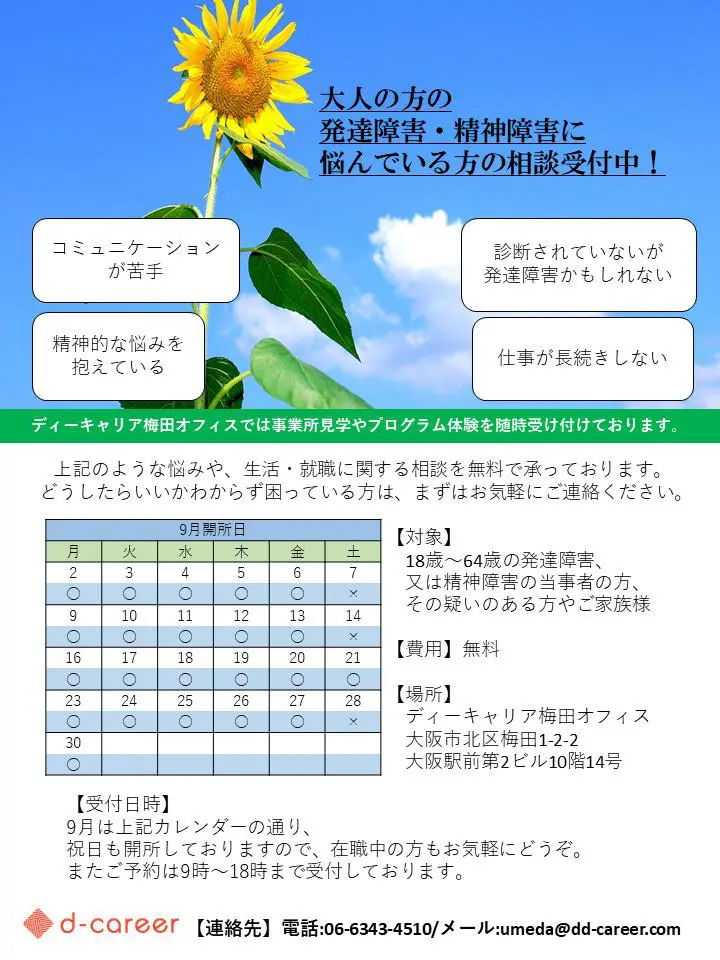 【ディーキャリア梅田オフィス】9月平日開催「9月の事業所見学・体験日のお知らせ」