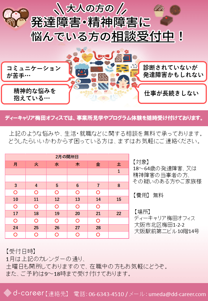 【ディーキャリア梅田オフィス】2月平日開催「2月の事業所見学・体験日のお知らせ」