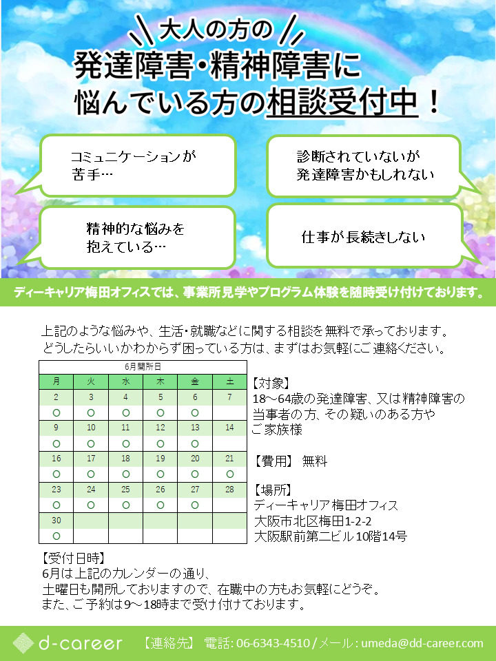 【ディーキャリア梅田オフィス】6月平日開催「6月の事業所見学・体験日のお知らせ」