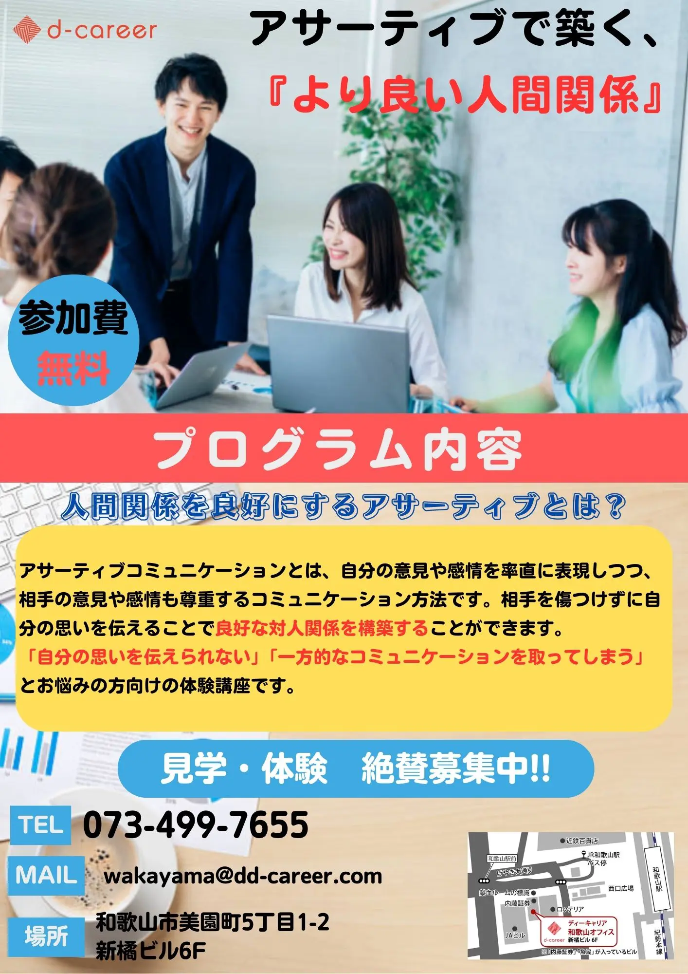 【ディーキャリア和歌山オフィス】9月03日(火)・11日(水)・20日(金)「アサーティブコミュニケーション プログラム体験」