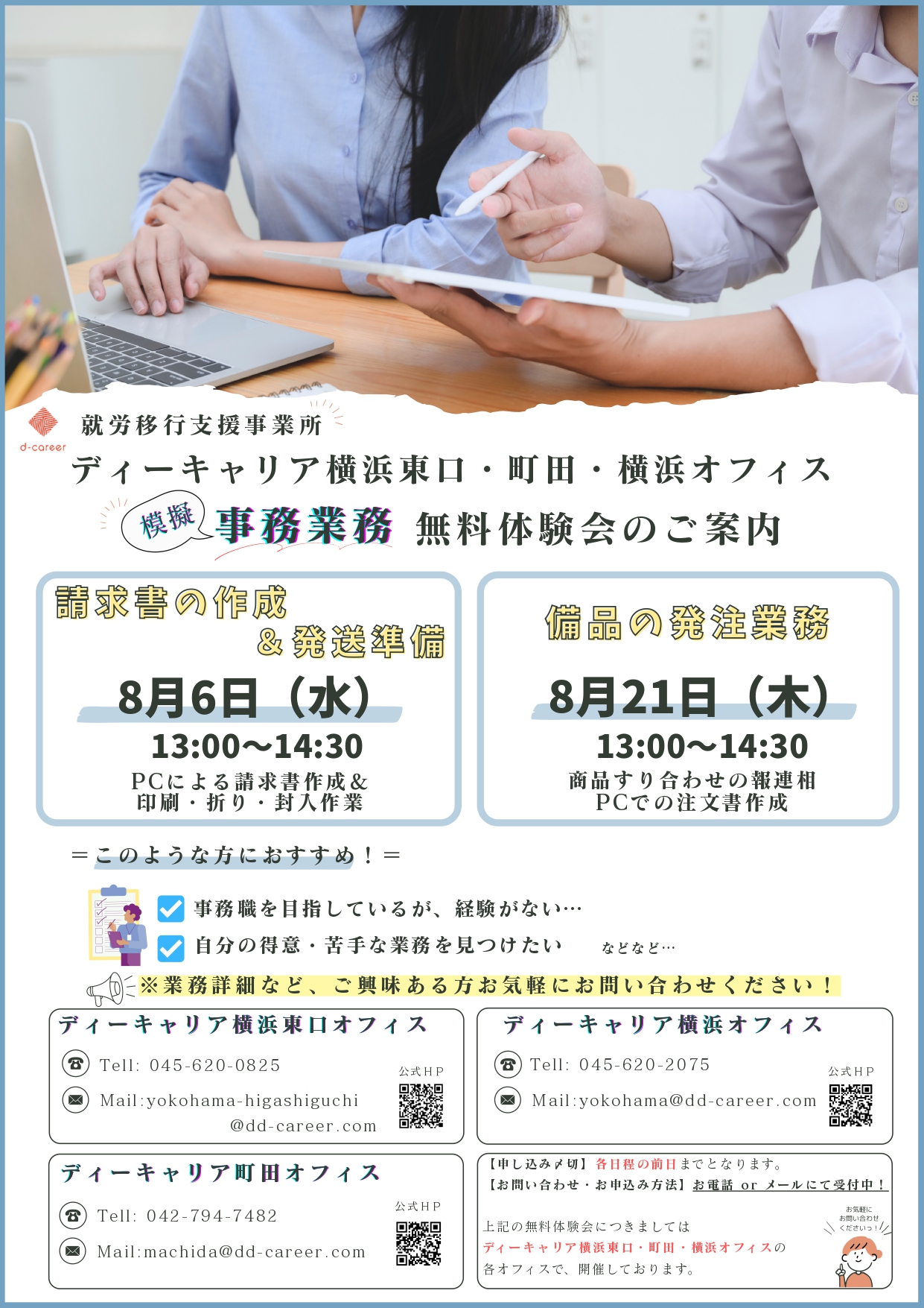 【ディーキャリア横浜東口オフィス】8月06日(水)・21日(木)「事務業務無料体験会」