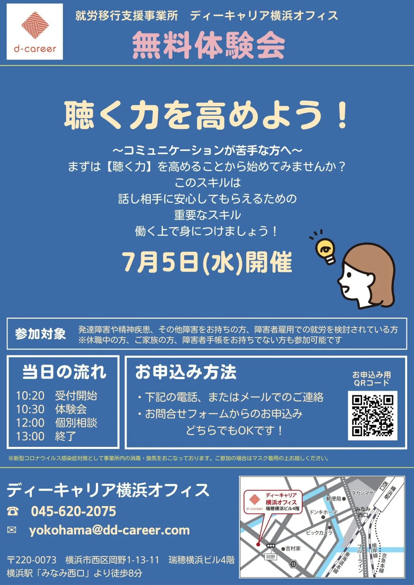 7月5日(水)ディーキャリア横浜オフィス 無料体験会「聴く力を高めよう」開催!