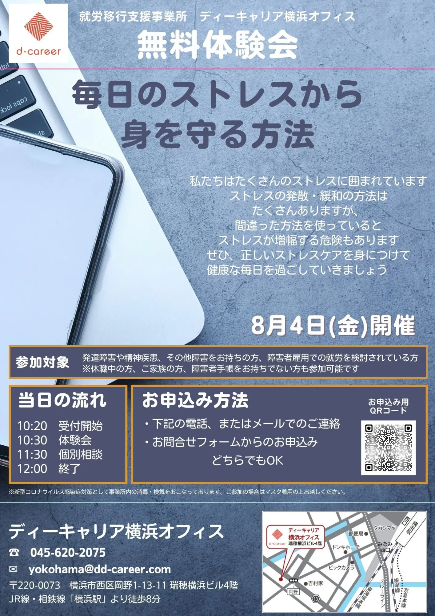 8月4日(金)ディーキャリア横浜オフィス 無料体験会「ストレスから身を守る方法」開催!