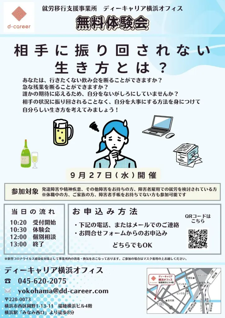 9月27日(水)ディーキャリア横浜 無料体験会「相手に振り回されない生き方とは?」開催!