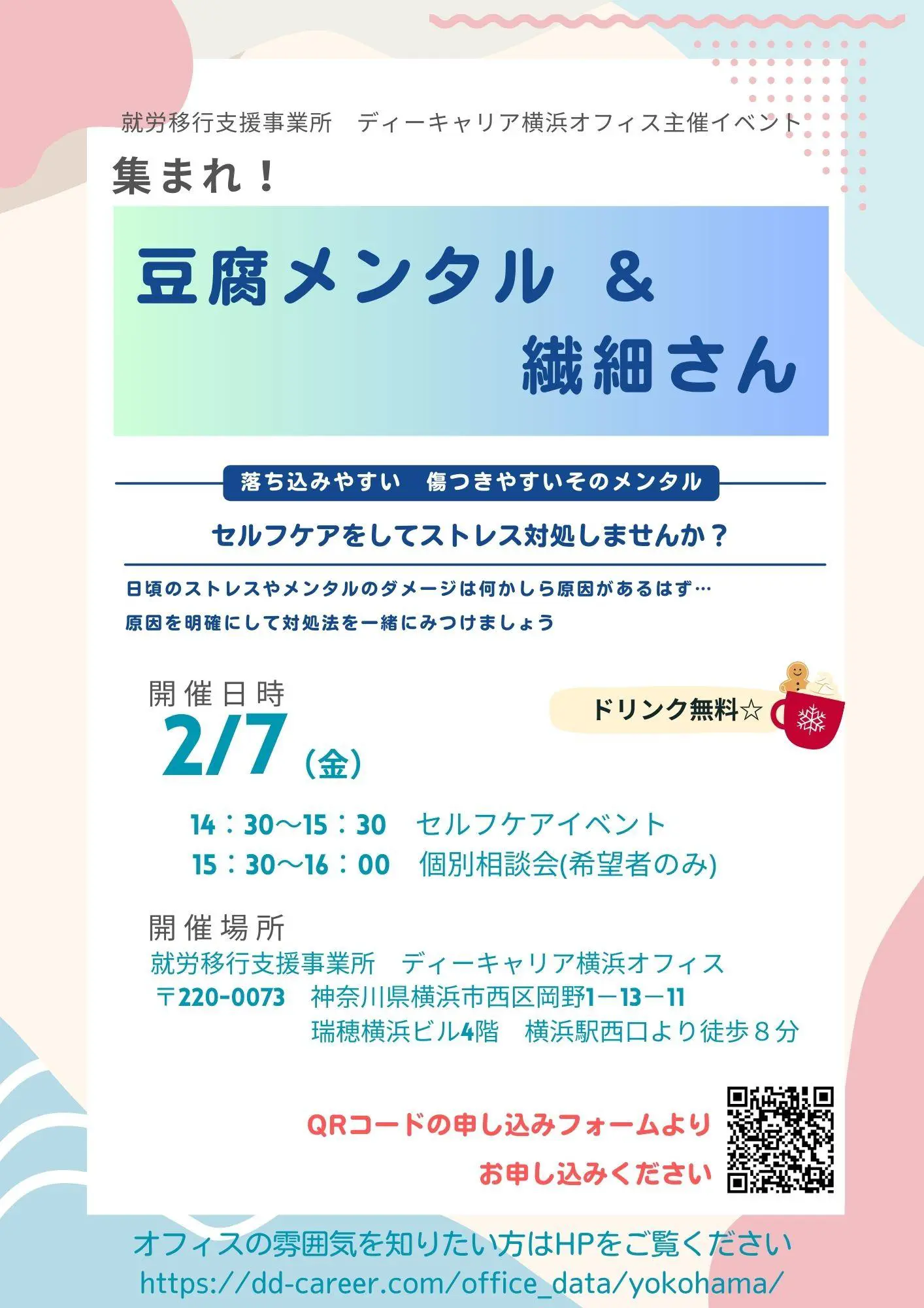 【ディーキャリア横浜オフィス】2月7日(金)「~豆腐メンタル&繊細さん セルフケアをしてストレス対処をしてみませんか~」