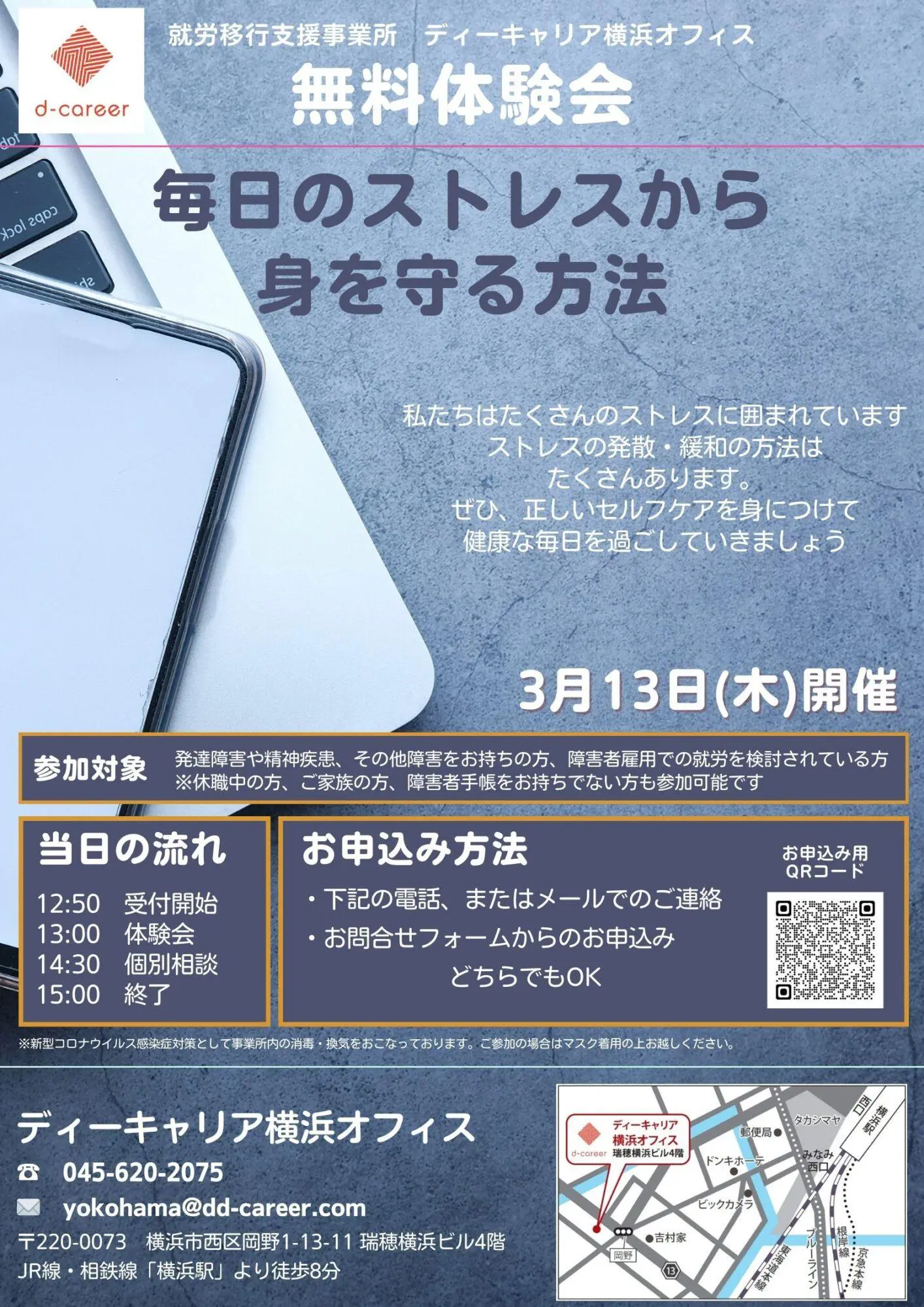 【ディーキャリア横浜オフィス】3月13日(木)「~毎日のストレスから身を守る方法~」