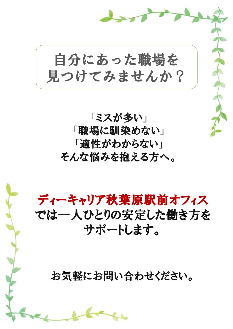 【ディーキャリア秋葉原駅前オフィス】毎週水曜日開催「『働きたいけど不安』という方はぜひご相談を」