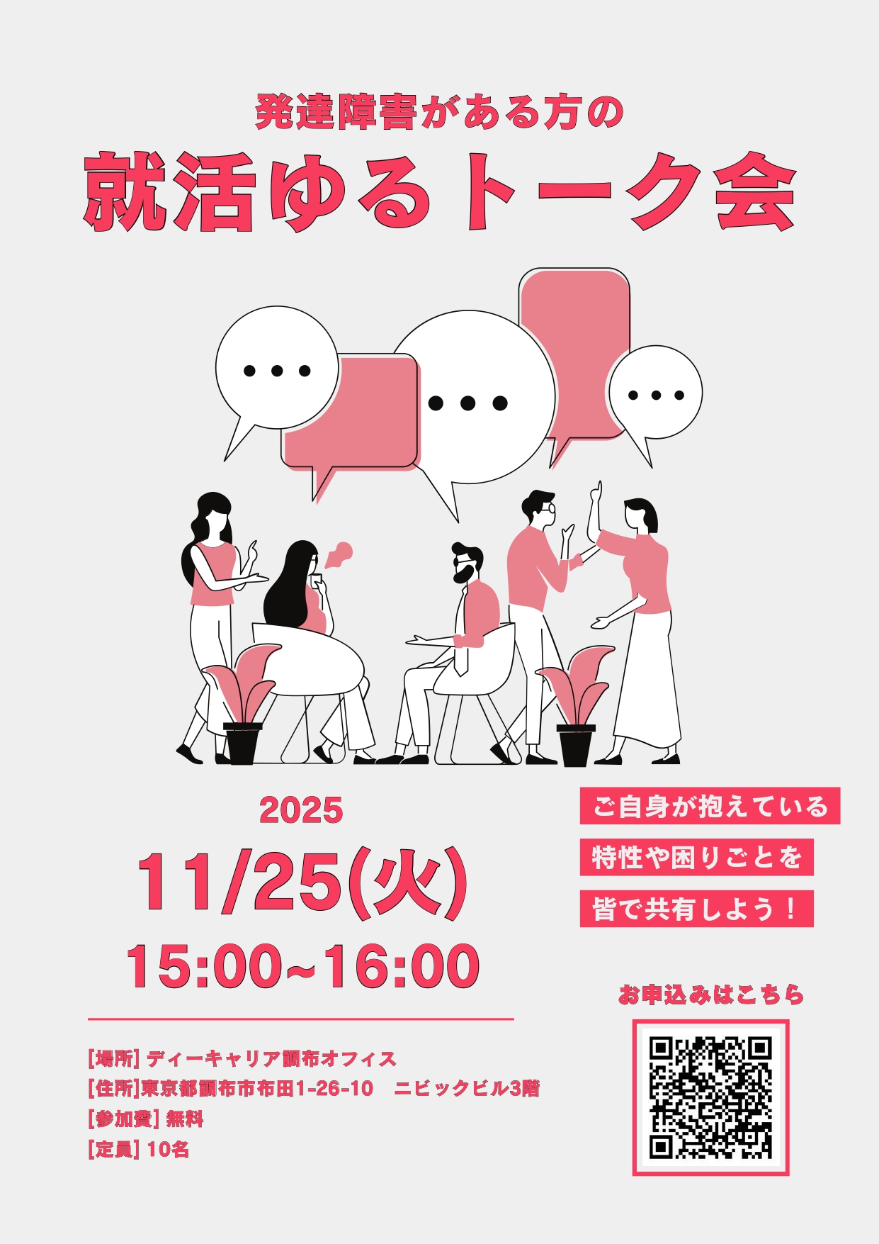 【ディーキャリア調布オフィス】11月25日(火)「発達障害がある方の就活ゆるトーク会」