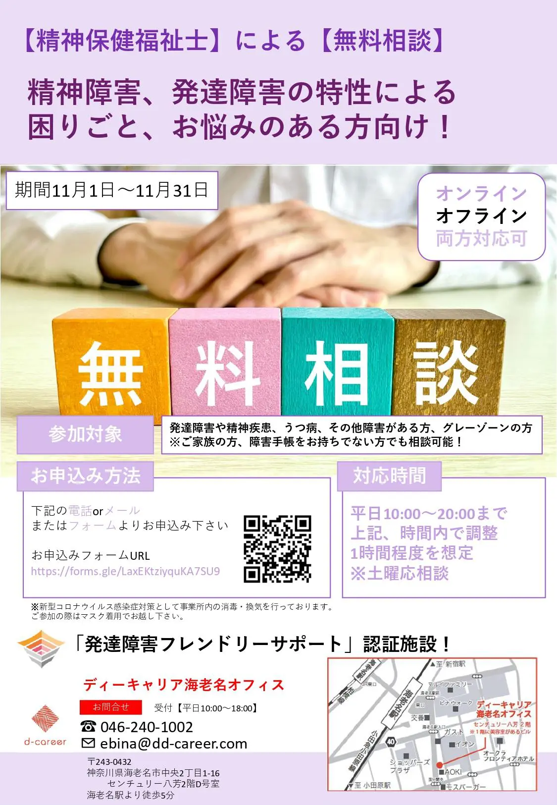 【ディーキャリア海老名オフィス】11月平日開催「精神保健福祉士による困りごと相談」