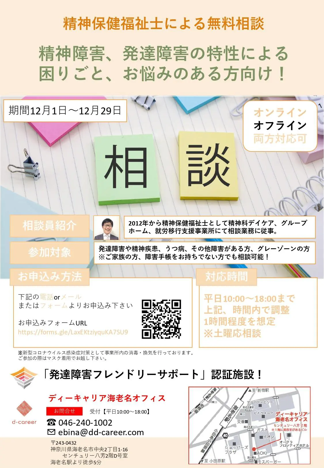【ディーキャリア海老名オフィス】12月開催「12月 【発達障害支援サポーター】による無料相談会のお知らせ✨」