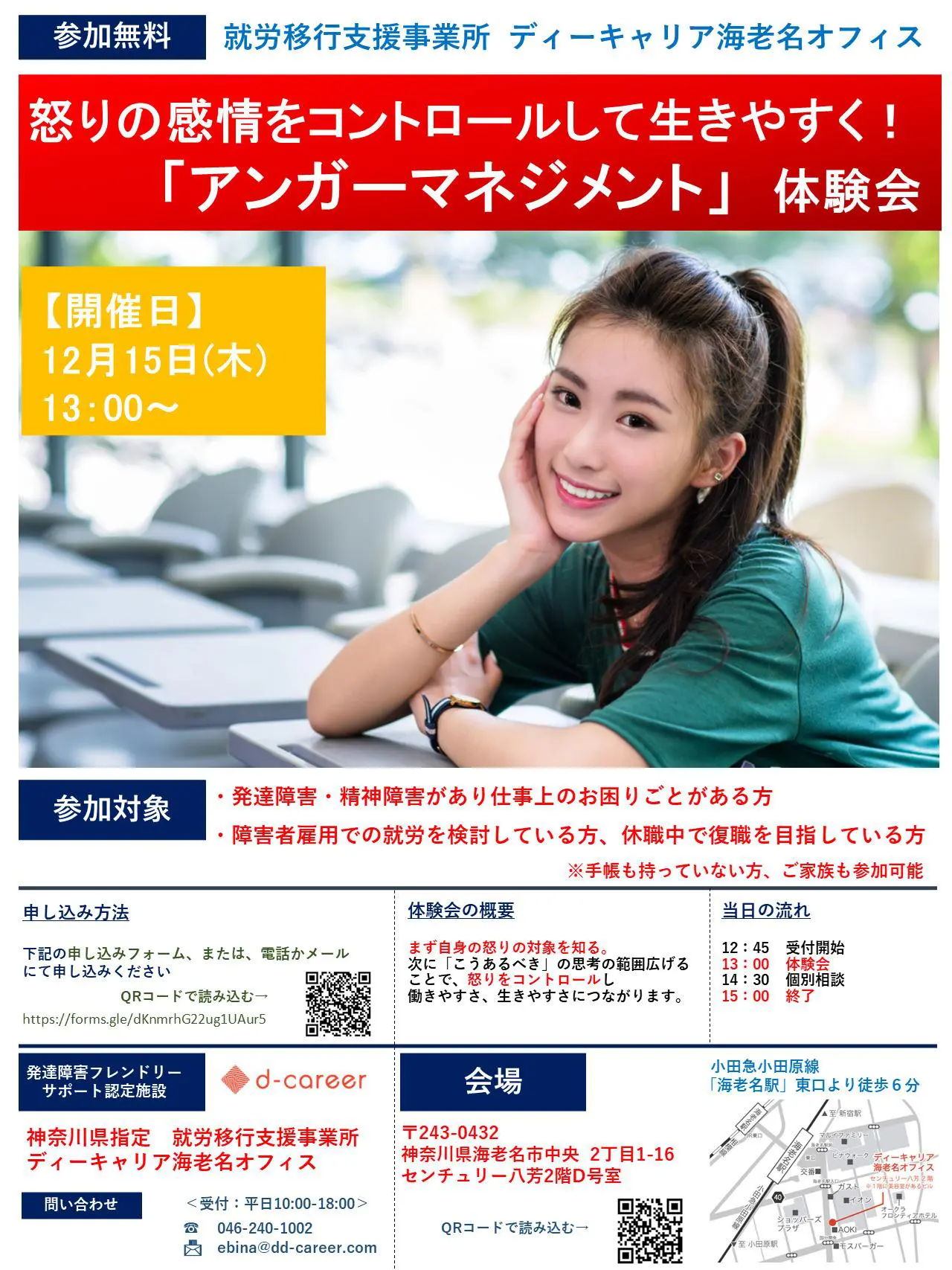 【ディーキャリア海老名オフィス】12月15日(木)開催「怒りの感情をコントロールして生きやすく!「アンガーマネジメント」体験会」