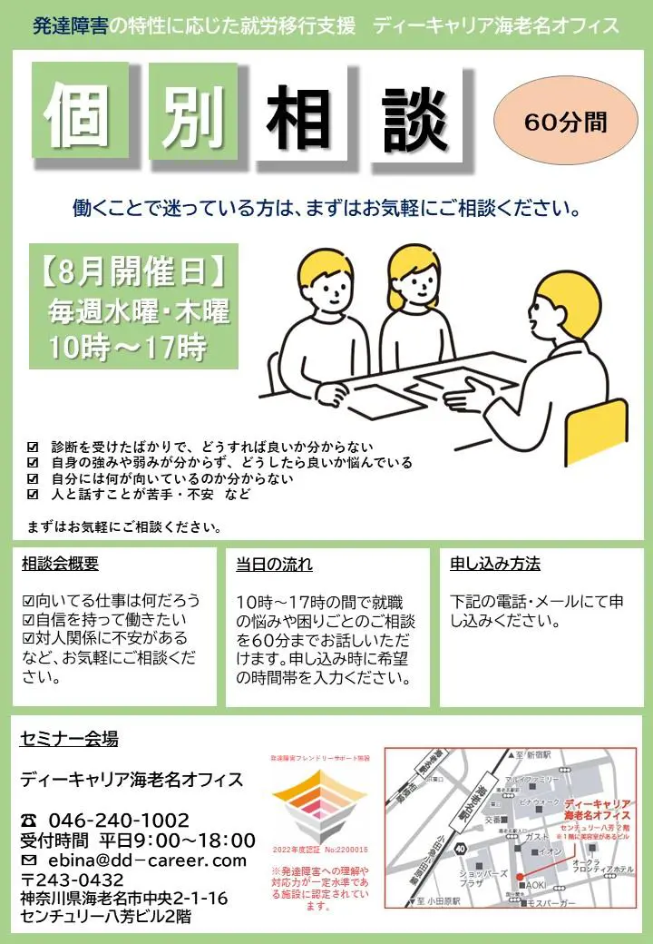 【ディーキャリア海老名オフィス】8月毎週水曜・木曜開催!「個別相談会」