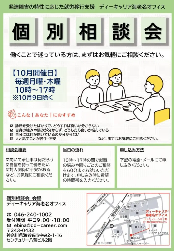 【ディーキャリア海老名オフィス】10月毎週月曜・木曜開催!「個別相談会」