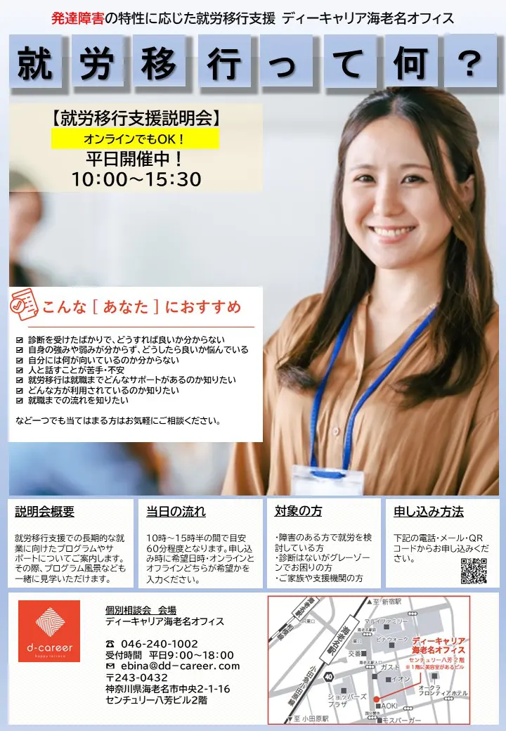 【ディーキャリア海老名オフィス】2024年1月平日開催「就労移行って何?ディーキャリアってどんなところ?就労移行個別説明会!オンラインも可!」