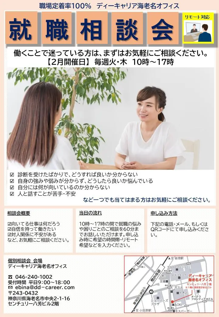 【ディーキャリア海老名オフィス】2月毎週火曜・木曜開催!「就職相談会開催!リモートもOK」