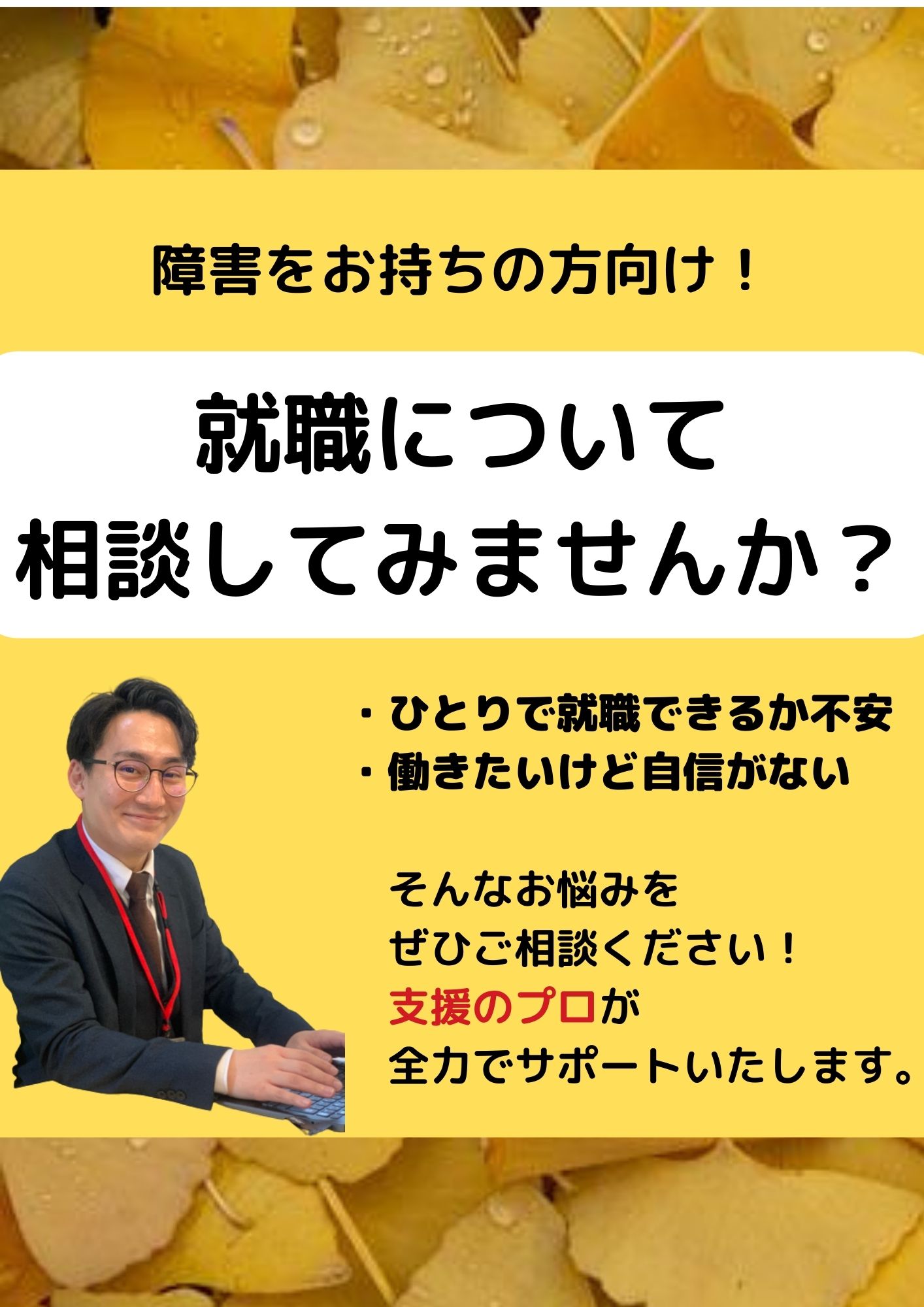 障害をお持ちの方の就職についてご相談いただけます。「障害と付き合いながら自分のペースで仕事をしたい」「自分に向いている仕事に就きたい」など、就職に関するお悩みをなんでもご相談ください!ジョブコーチの資格を持ったスタッフが全力でサポートいたします(^^)