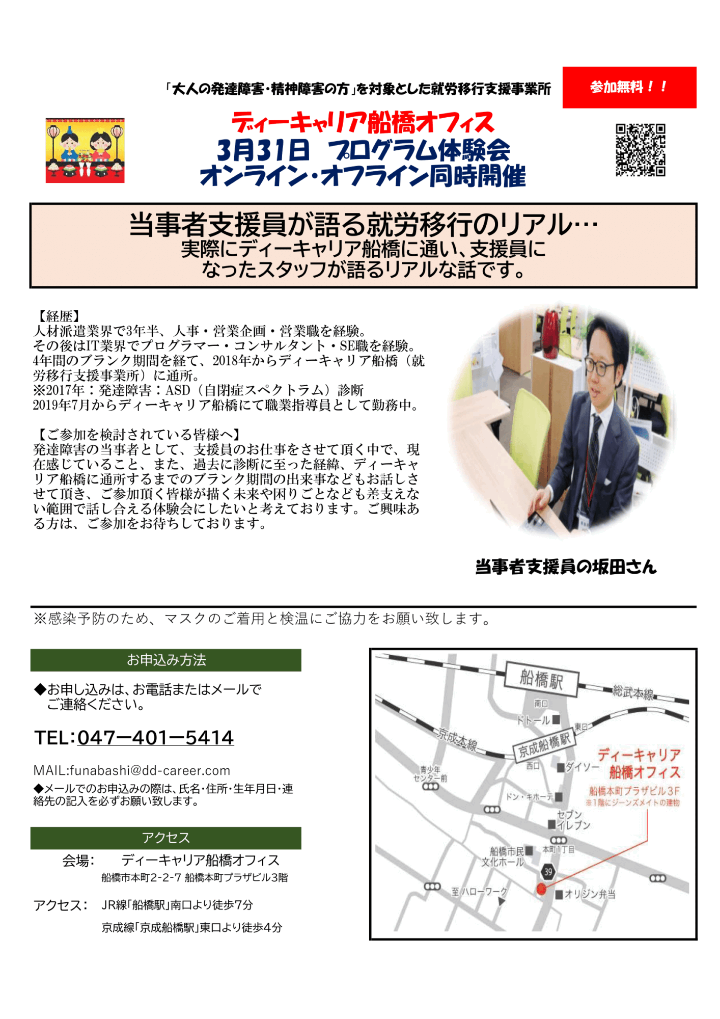 【ディーキャリア船橋オフィス】3月31日(金)「当事者支援員が語る就労移行のリアル…」