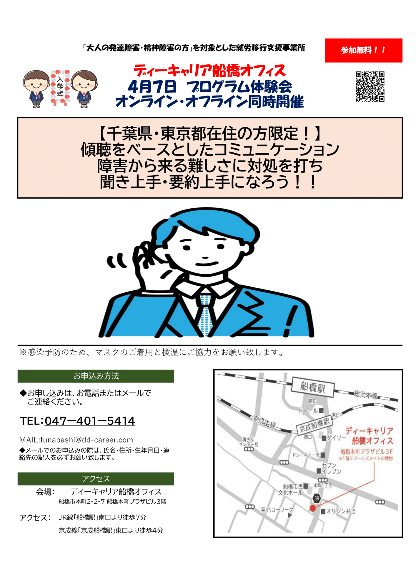【ディーキャリア船橋オフィス】4月7日(金)「【千葉県・東京都在住の方限定】傾聴をベースとしたコミュニケーション」