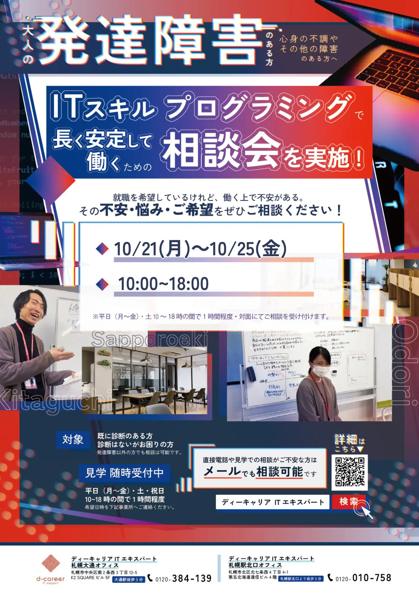 【ディーキャリアITエキスパート札幌大通オフィス 】10月21日(月)・22日(火)・23日(水)・24日(木)・25日(金)「発達障害の方・障害のある方のための就労相談会」