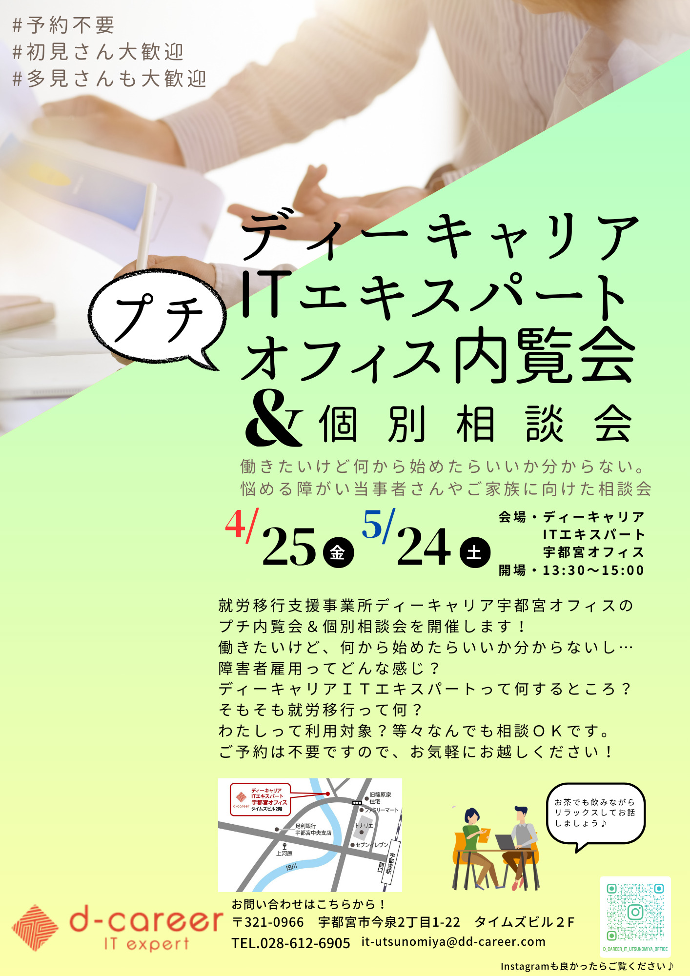 【ディーキャリアITエキスパート宇都宮オフィス】4月25日(金)・5月24日(土)「プチ オフィス内覧会&個別相談会」