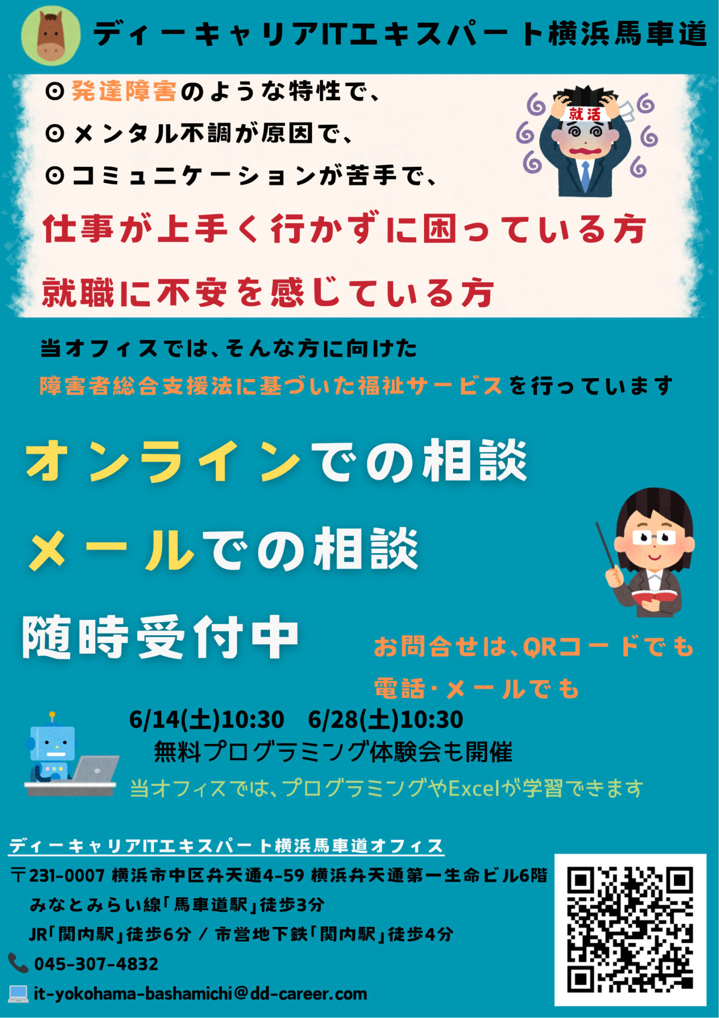 【ディーキャリアITエキスパート横浜馬車道オフィス】06月14日(土)・28日(土)「メンタル不調や発達障害の特性で、就職・仕事が上手く行かずに困っている方へ!! 無料相談&プログラミング体験」