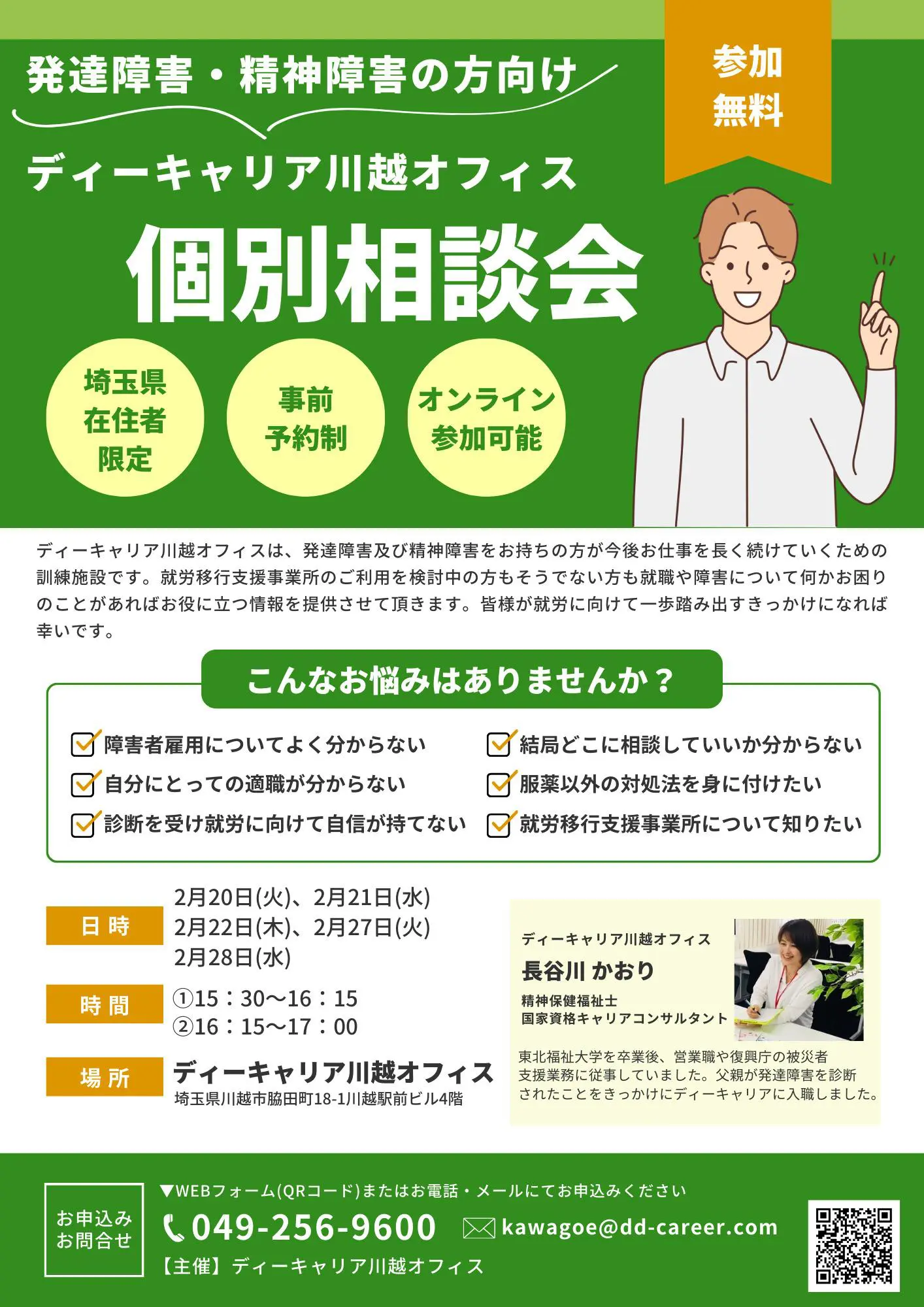 【ディーキャリア川越オフィス】2024年02月20日(火)・21日(水)・22日(木)・27日(火)・28日(水)「発達障害・精神障害の方向け個別相談会(オンライン可)」