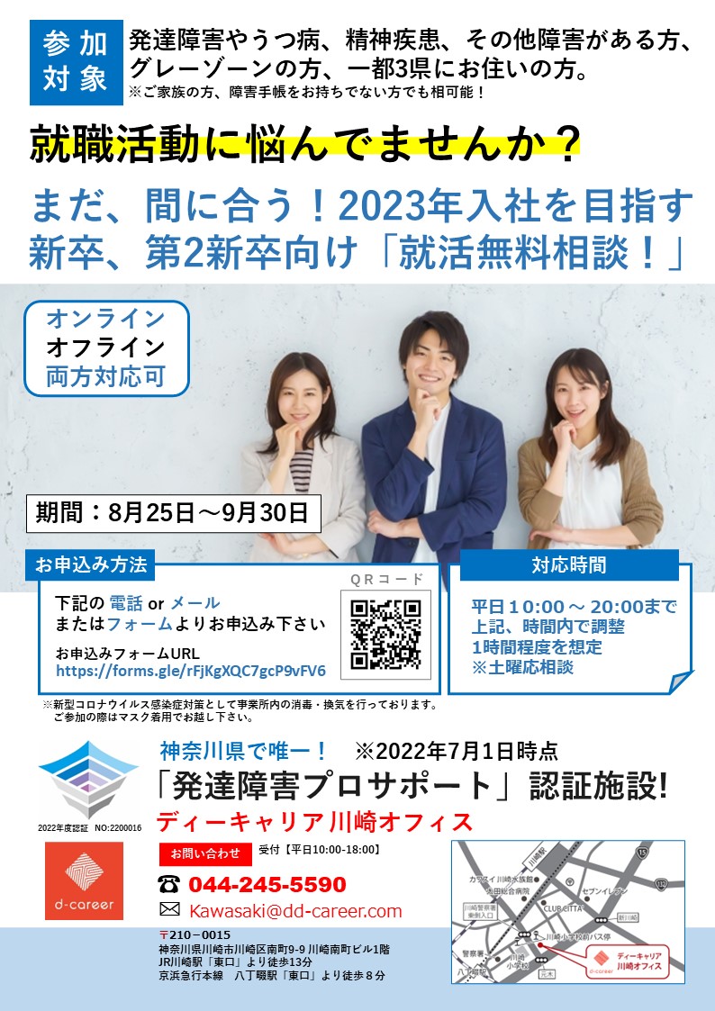 【ディーキャリア川崎オフィス】8月25日(木)~9月30(金)「まだ間に合う!2023年入社を目指す 新卒、第2新卒向け「就活無料相談!」」