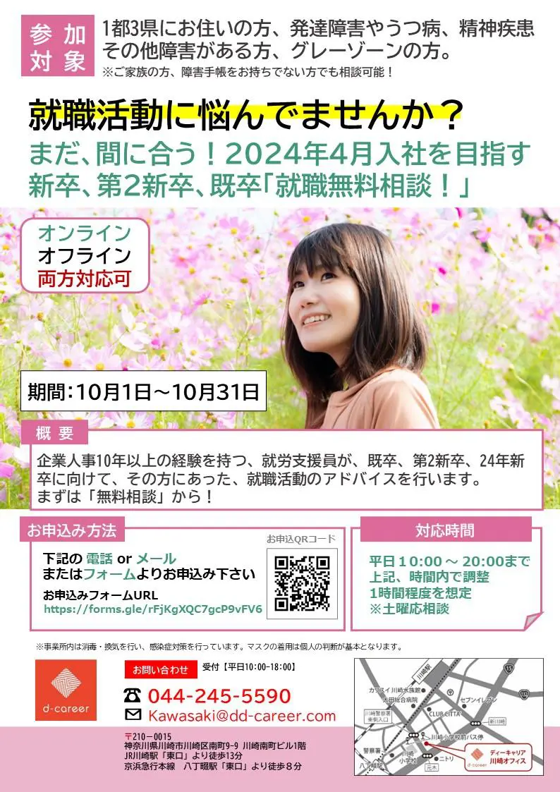 【ディーキャリア川崎オフィス】10月平日開催「就職活動に悩んでませんか? まだ間に合う! 2024年4月入社を目指す 新卒、第2新卒、既卒「就活無料相談!」」