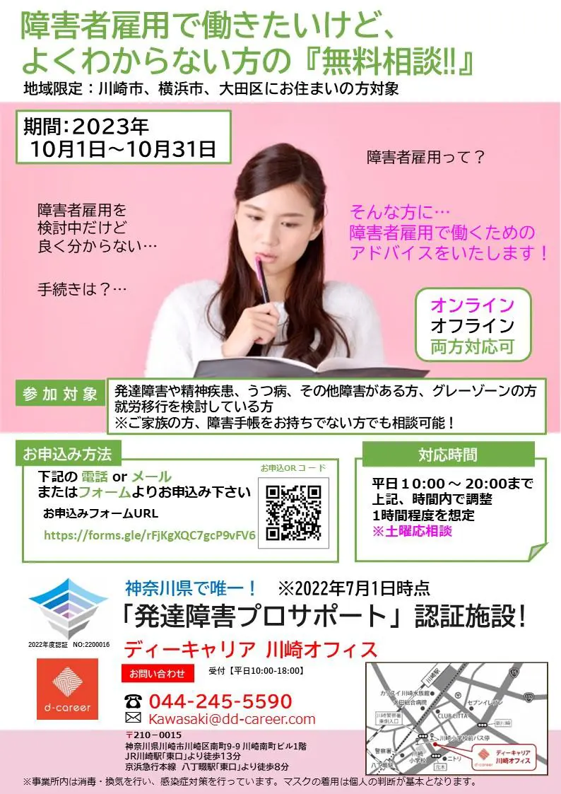 【ディーキャリア川崎オフィス】10月1日(金)~10月31日(日)「【精神保健福祉士】による【無料相談】発達障害、その他障害の特性による困りごとのある方向け!」