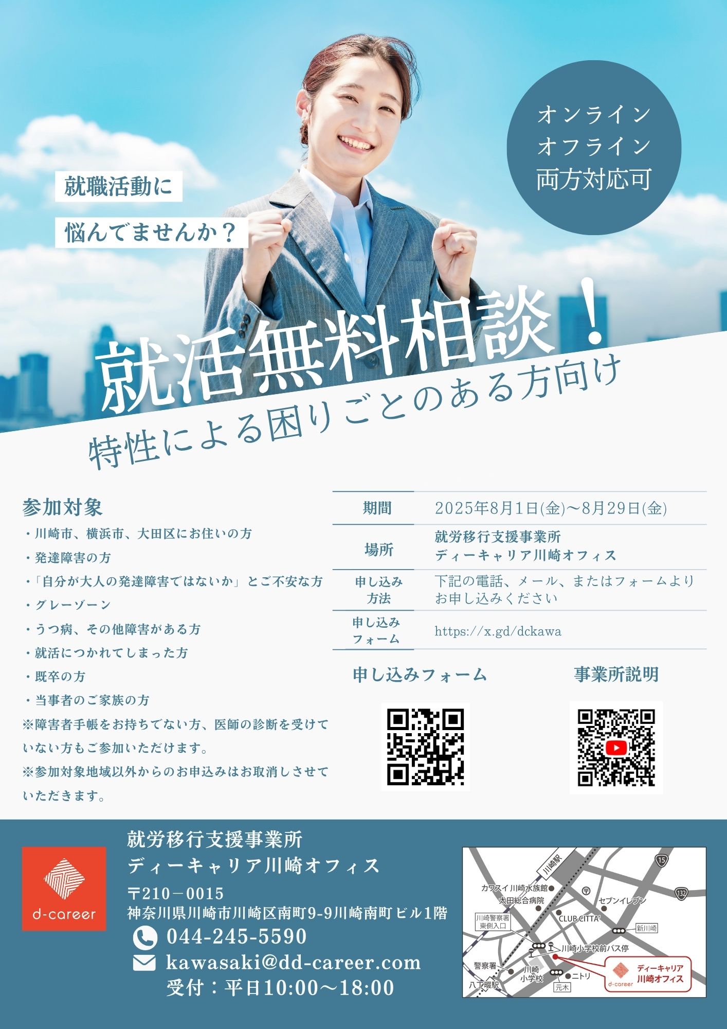 【ディーキャリア川崎オフィス】8月平日開催<地域限定:川崎市、横浜市、大田区にお住まいの方対象> 就職活動に悩んでませんか? 特性による困りごとのある方向け!「就活無料相談!」