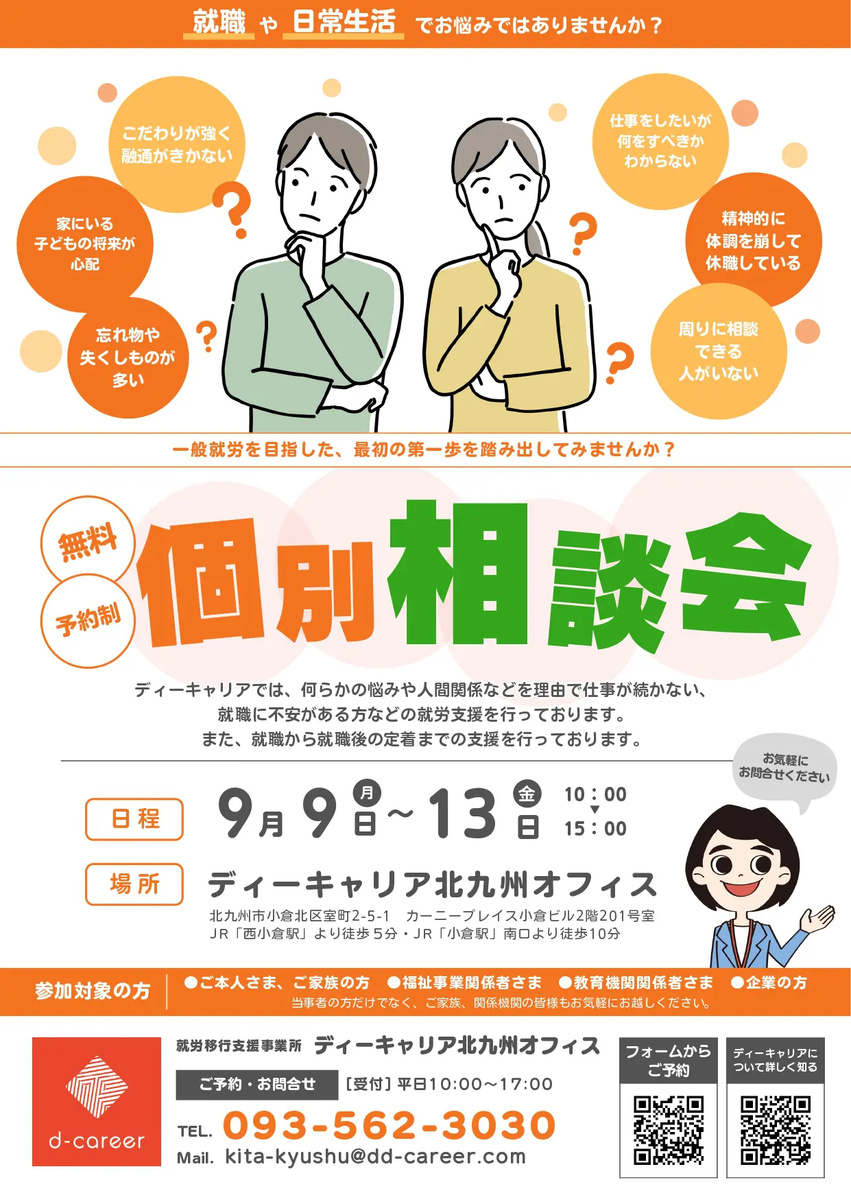 【ディーキャリア北九州オフィス】9月09日(月)・10日(火)・11日(水)・12日(木)・13日(金)「無料!個別相談会」