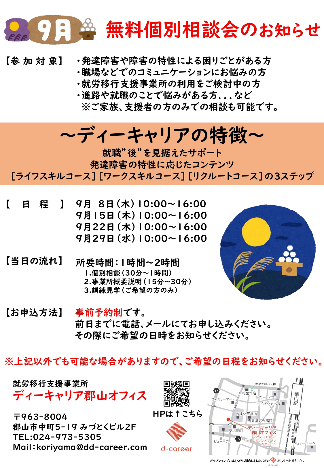 【ディーキャリア郡山オフィス】9月8日(木)・15日(木)・22日(木)・29日(木)「無料個別相談会」