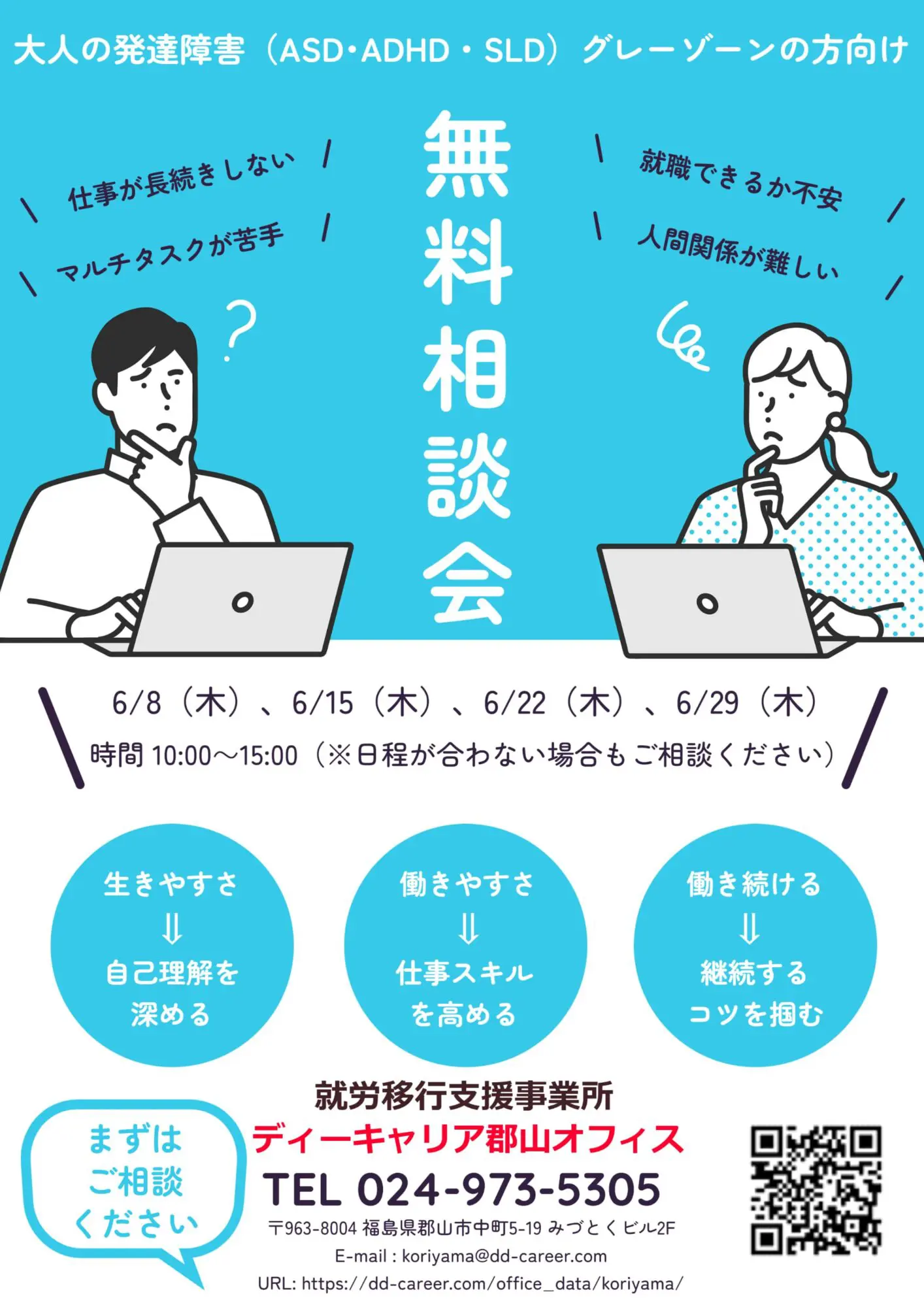 【ディーキャリア郡山オフィス】6月08日(木)・6月15日(木)・6月22日(木)・6月29日(木)「大人の発達障害(ASD・ADHD・SLD)・グレーゾーン~無料個別相談会~」