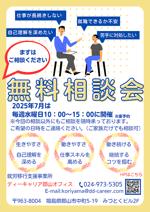 【ディーキャリア郡山オフィス】07月02日(水)・09日(水)・16日(水)・23日(水)・30日(水)「長期就労を目指す!大人の発達障害(ASD・ADHD・SLD)・グレーゾーン~無料個別相談会~」