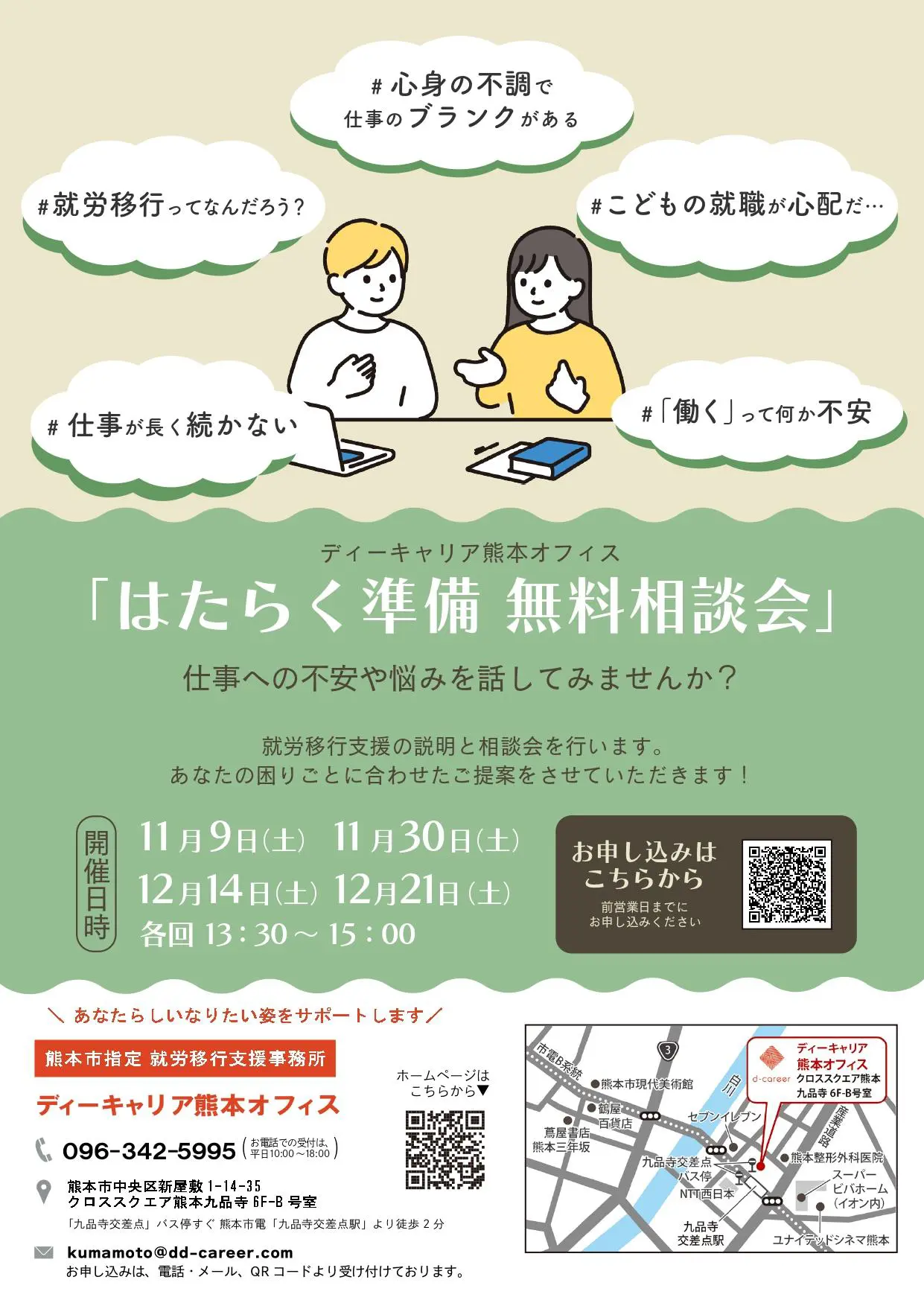 【ディーキャリア熊本オフィス】11月09日(土)・11月30日(土)・12月14日(土)・12月21日(土)「はたらく準備無料相談会」