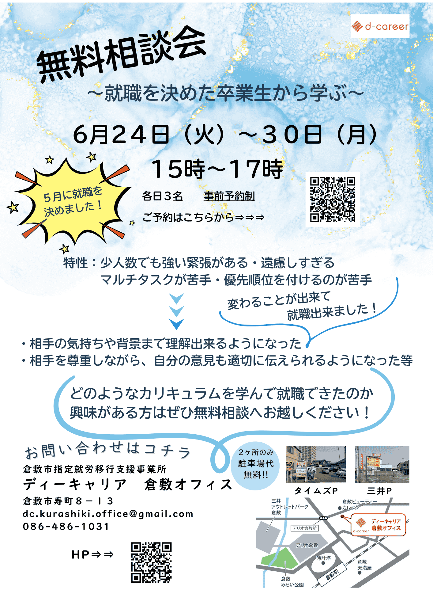 【ディーキャリア倉敷オフィス】6月24日(火)・25日(水)・26日(木)・27日(金)・30日(月)「無料相談会」