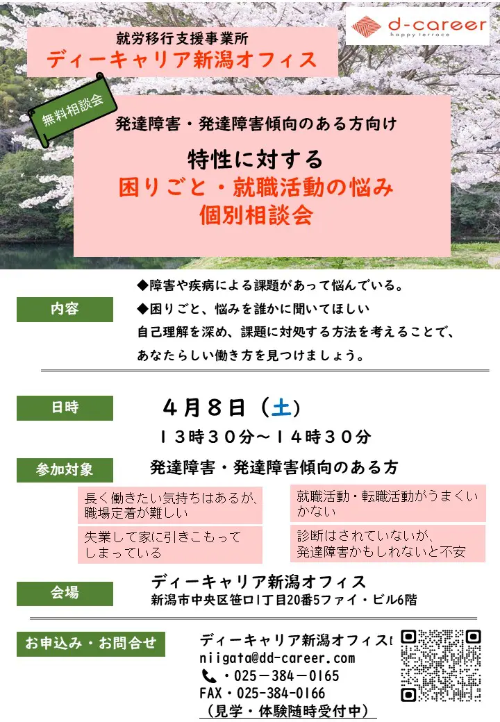 【ディーキャリア新潟オフィス】4月8日(土)「発達障害の特性に対する「困りごと・就職活動の悩み」個別相談会」