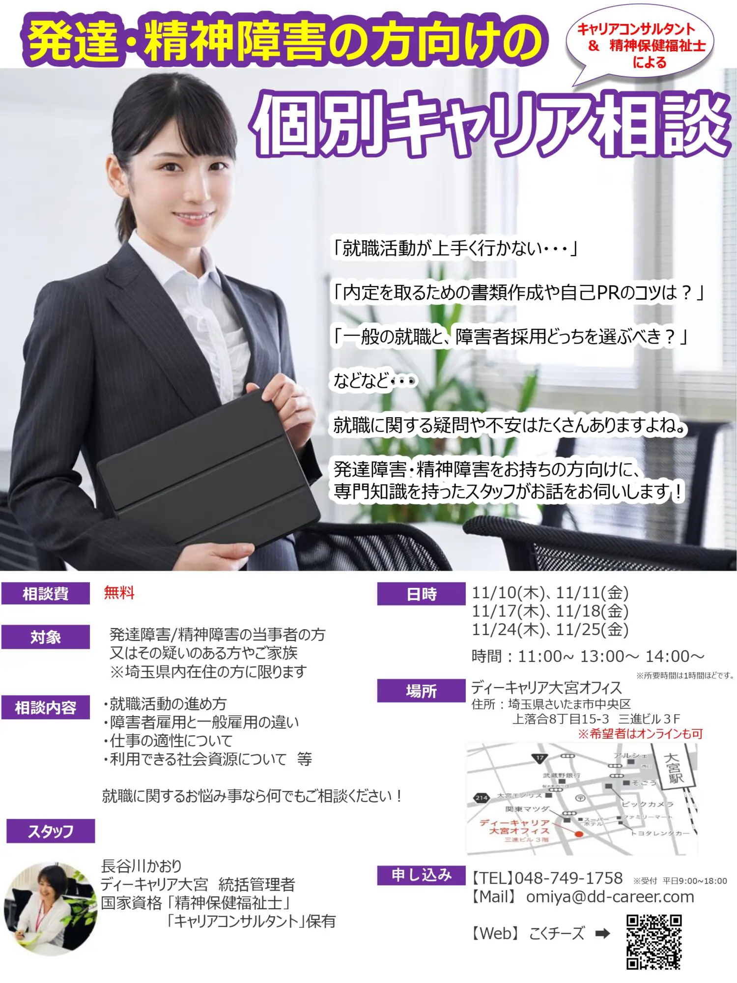 【ディーキャリア大宮オフィス】11月毎週木・金曜日開催「発達・精神障害の方向けの個別キャリア相談」
