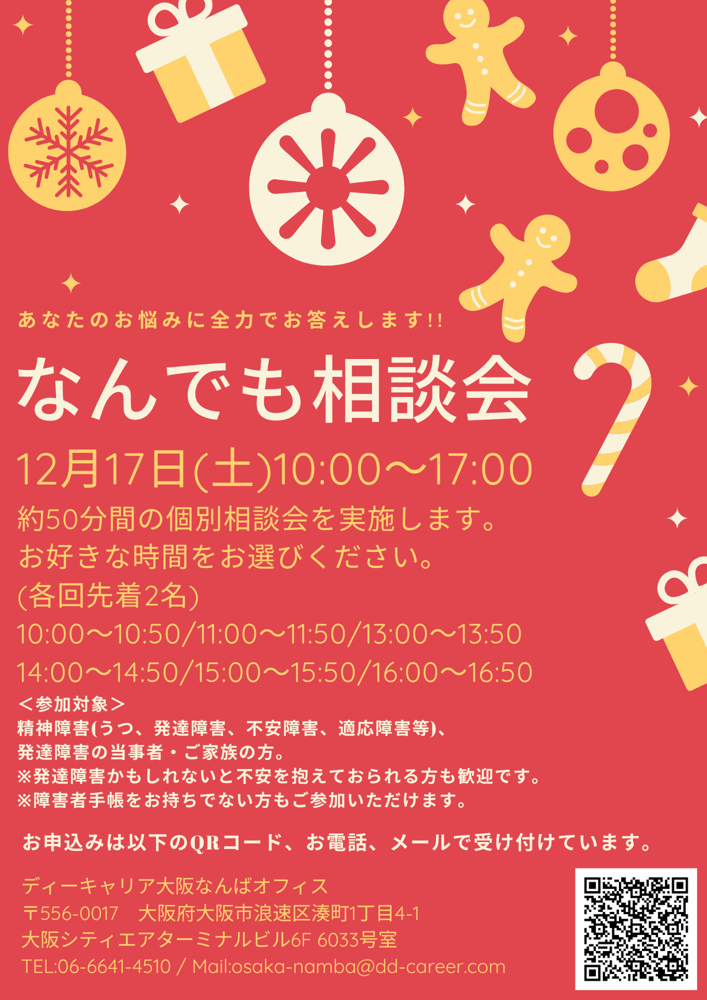 【ディーキャリア大阪なんばオフィス】12月17日(土)「<12月度>なんでも相談会~あなたの悩みに全力でお答えします~」