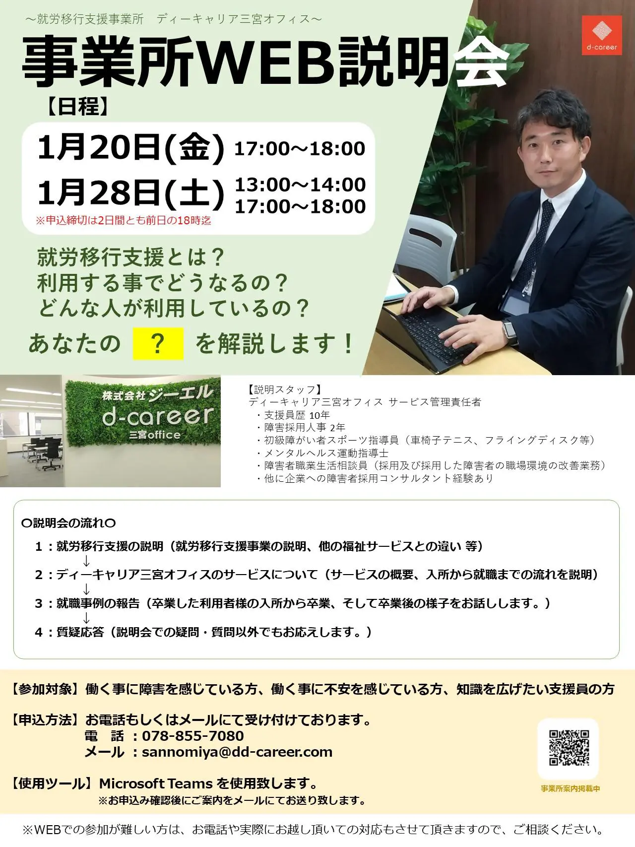 【ディーキャリア三宮オフィス】1月20日(金)・28日(土)「事業所WEB説明会」