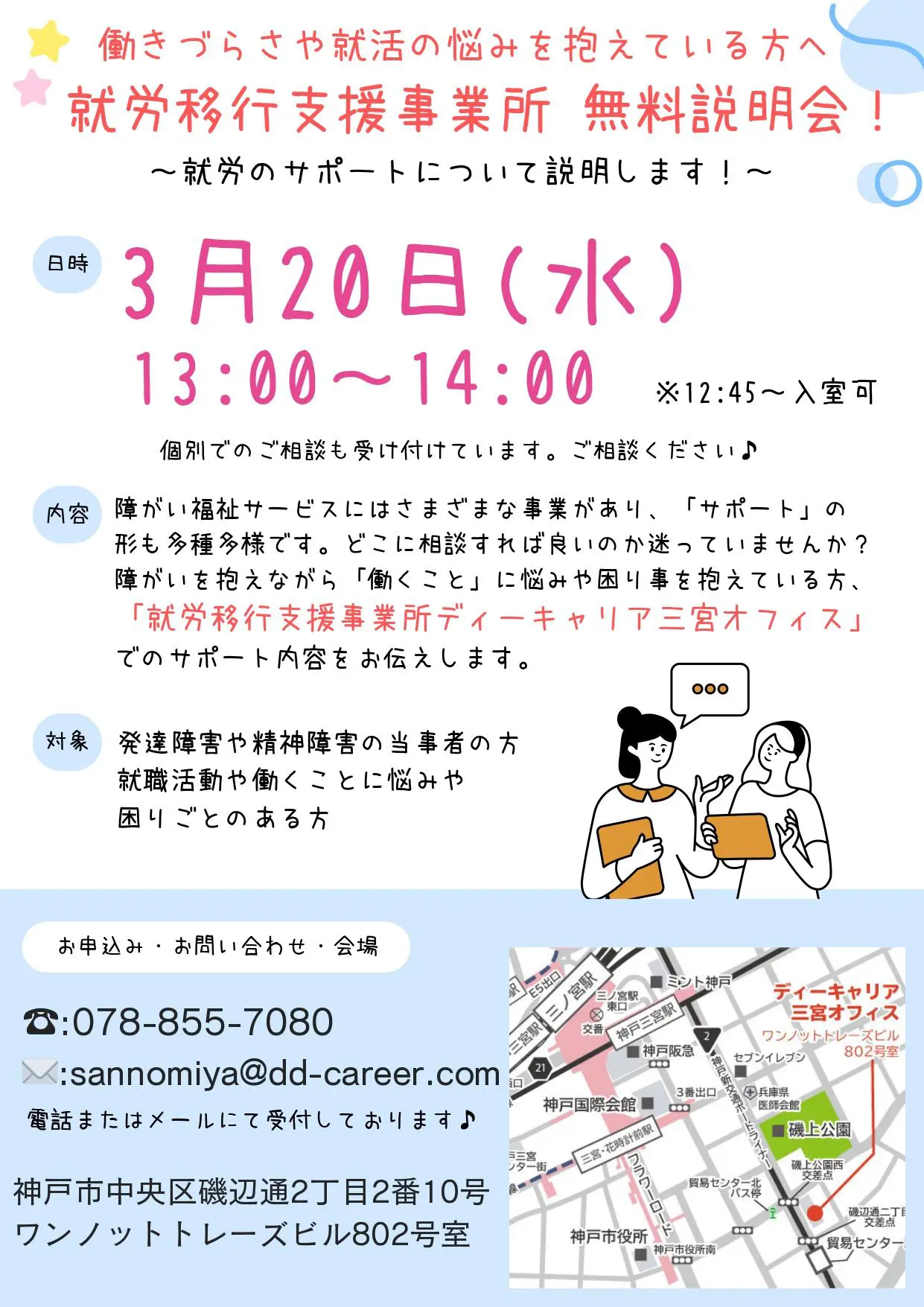 【ディーキャリア三宮オフィス】3月20日(水)「働きづらさや就活の悩みを抱えている方へ 就労移行支援事業所無料説明会!~就労のサポートについて説明します!~」