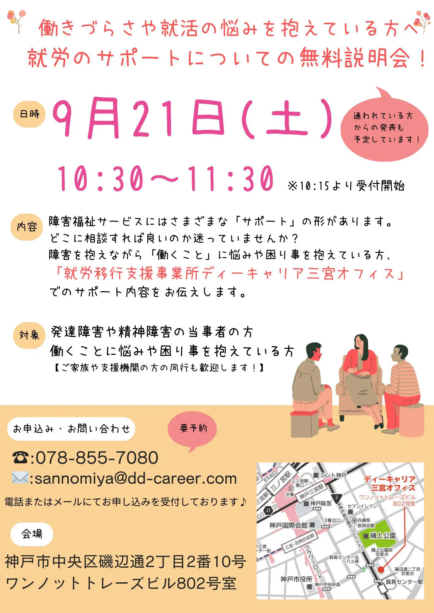 【ディーキャリア三宮オフィス】9月21日(土)「【働きづらさや就活の悩みを抱えている方へ】就労のサポートについての無料説明会!~」