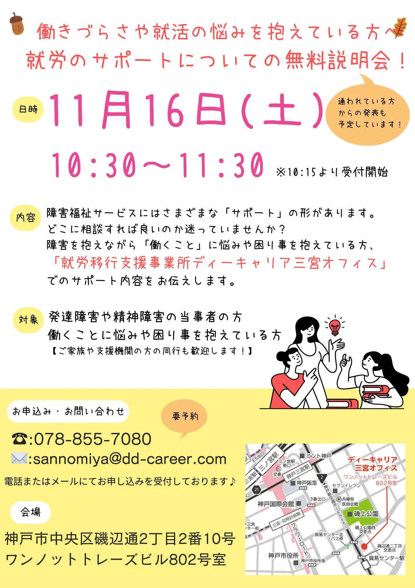 【ディーキャリア三宮オフィス】11月16日(土)「【働きづらさや就活の悩みを抱えている方へ】就労のサポートについての無料説明会!~」