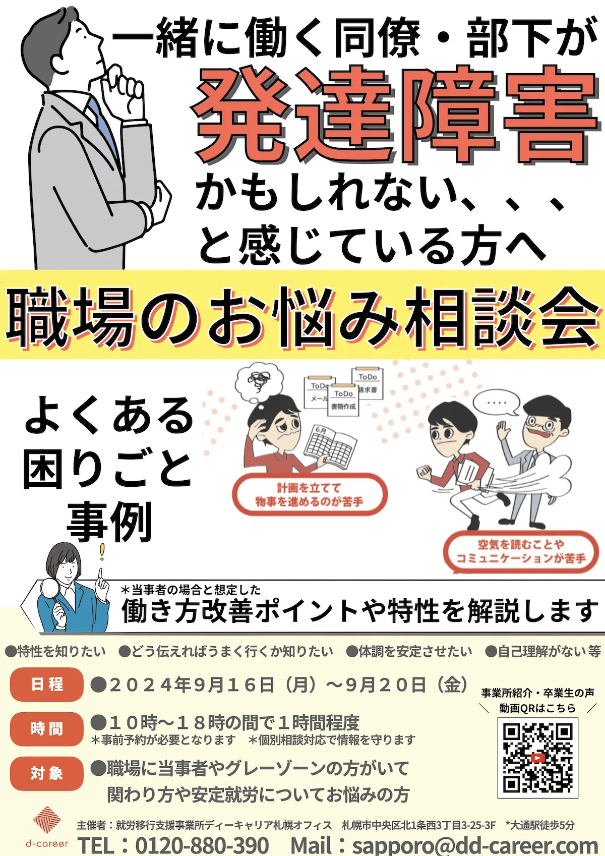 【ディーキャリア札幌オフィス】9月16日(月)・17日(火)・18日(水)・19日(木)・20日(金)「一緒に働く同僚・部下が発達障害かもしれない、と感じている方のための職場のお悩み相談会」