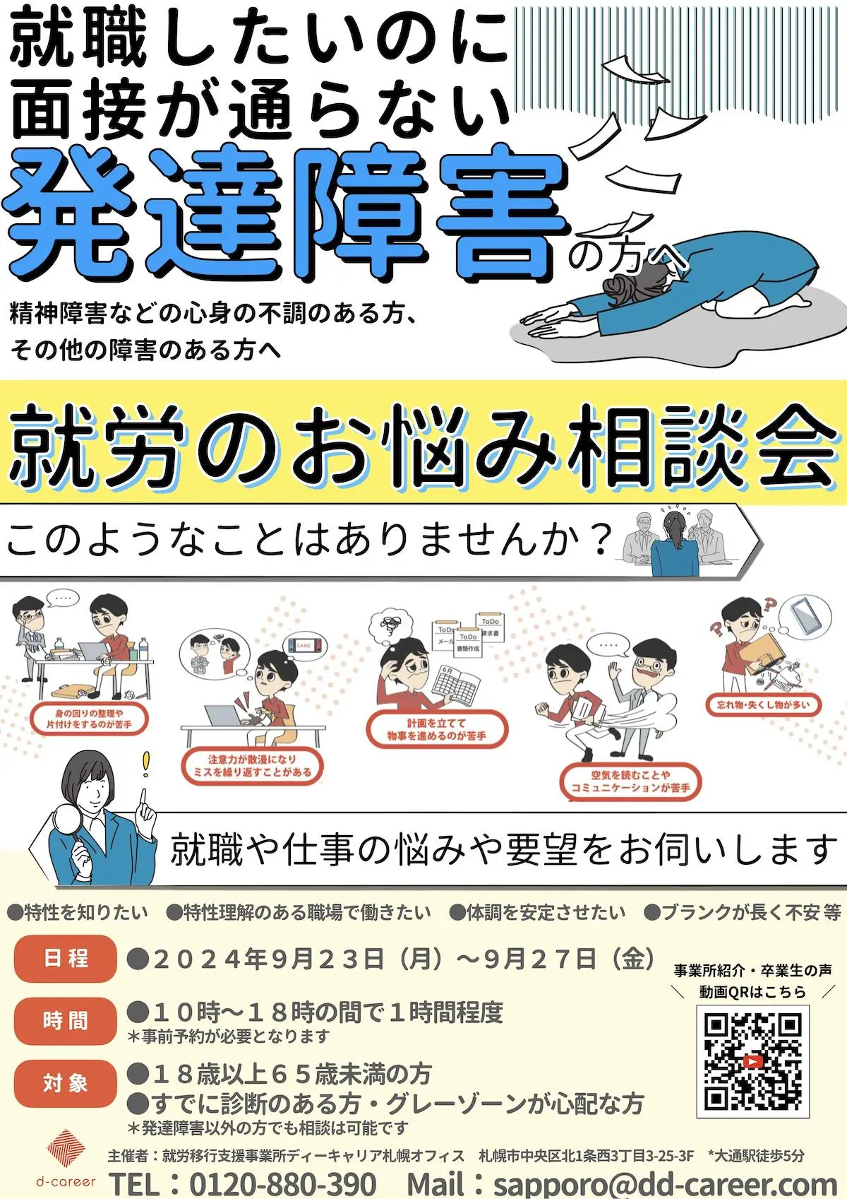 【ディーキャリア札幌オフィス】9月23日(月)・24日(火)・25日(水)・26日(木)・27日(金)「発達障害の方・障害のある方のための就労相談会」