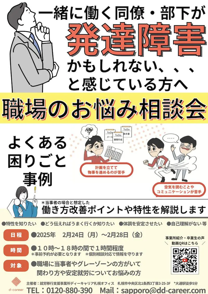 【ディーキャリア札幌オフィス】02月24日(月)・25日(火)・26日(水)・27日(木)・28日(金)「一緒に働く同僚・部下が発達障害かもしれない、と感じている方のための職場のお悩み相談会」