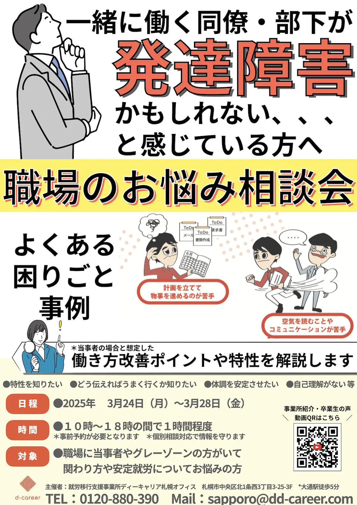【ディーキャリア札幌オフィス】03月24日(月)・25日(火)・26日(水)・27日(木)・28日(金)「一緒に働く同僚・部下が発達障害かもしれない、と感じている方のための職場のお悩み相談会」