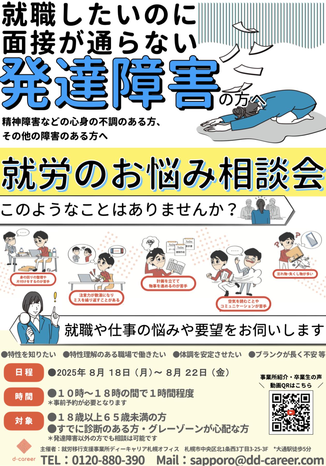 【ディーキャリア札幌オフィス】08月18日(月)・19日(火)・20日(水)・21日(木)・22日(金)「発達障害・精神障害のある方のための就労相談会」