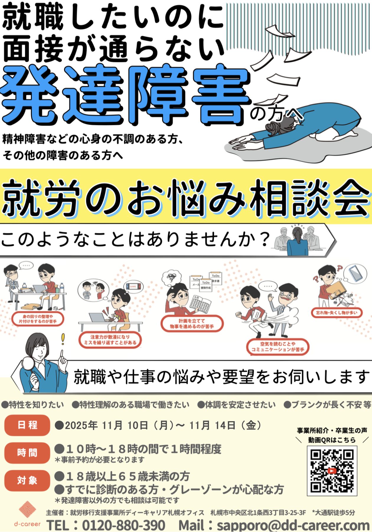 【ディーキャリア札幌オフィス】11月10日(月)・11日(火)・12日(水)・13日(木)・14日(金)「発達障害の方・障害のある方のための就労相談会」